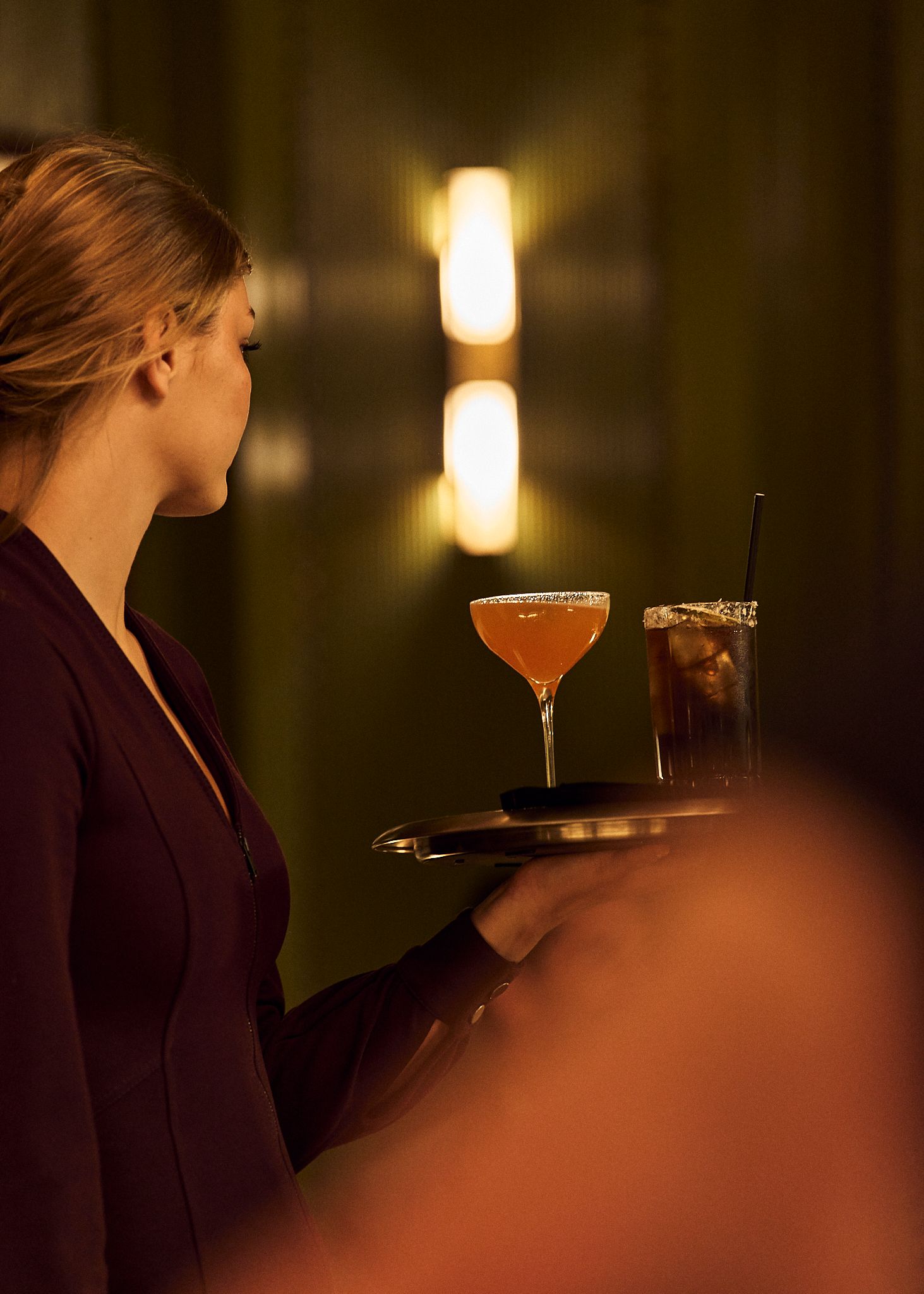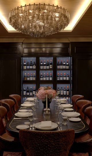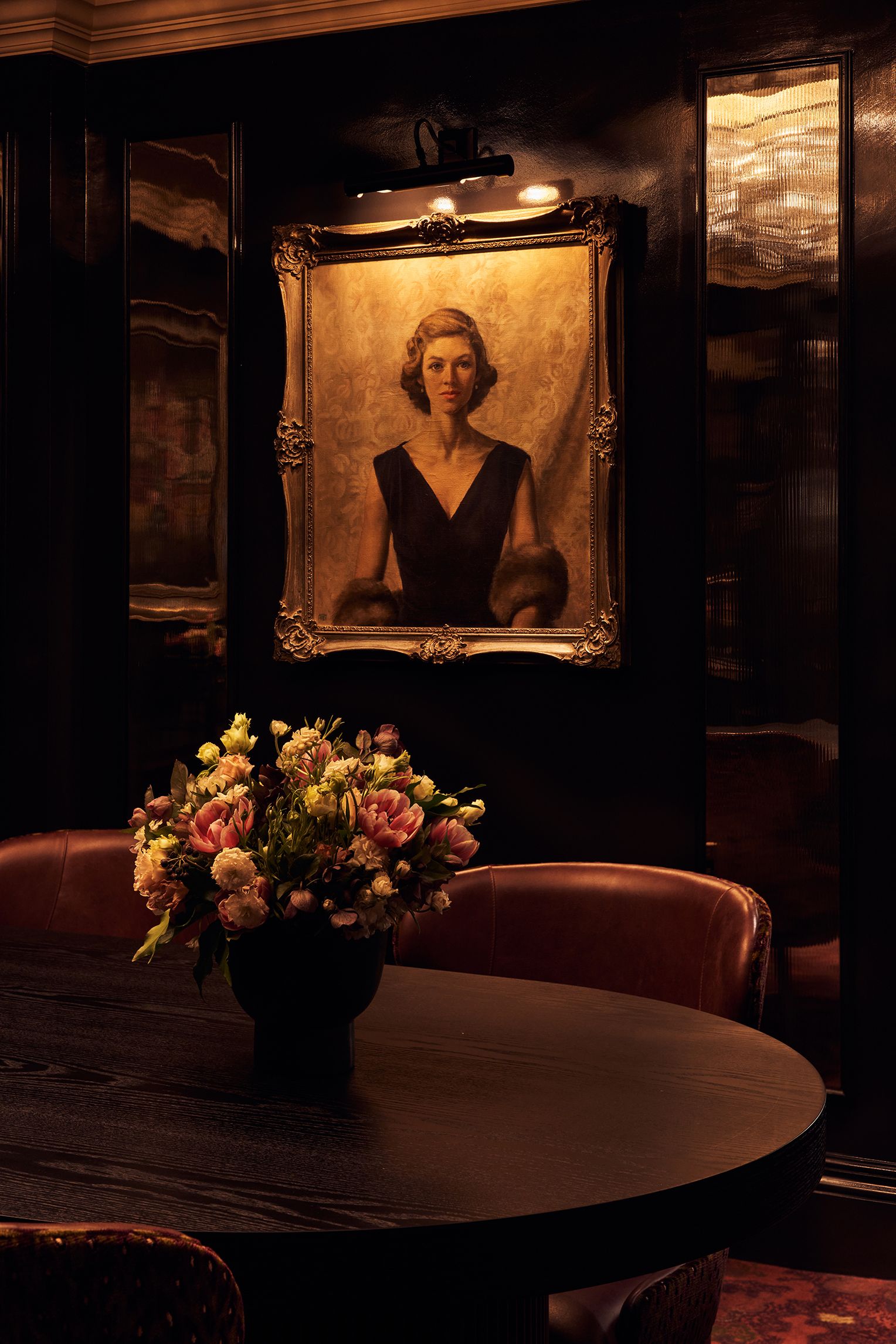 Inspired by the portrait of an enigmatic socialite, the Lady in Black is a glamorous private dining room designed for unforgettable gatherings. Accommodating up to 8 guests for an intimate dinner or 20 for a standing reception, this secluded space combines old-world charm with modern elegance. Rich dark wood panelling and antique stained mirrors envelop the room in mystery and warmth, while a dramatic glass chandelier and an impressive wine wall lend a refined touch. Hidden from view yet positioned at the heart of the Club, the Lady in Black invites guests into a world of timeless sophistication.
